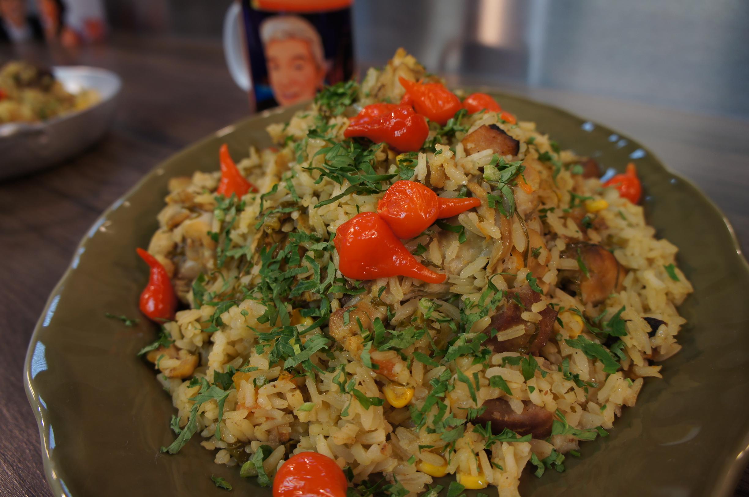 Temperar o frango com sal, limão, páprica e açafrão da terra. Em uma panela, esquentar o óleo e dourar bem o frango salpicando farinha de trigo. Depois de dourar o frango, reservar. Na mesma panela, dourar o bacon, o alho, a cebola, a cenoura, o tomate e a couve. Voltar com o frango, colocar o caldo, o arroz e cozinhar até o arroz ficar macio. Finalizar com o milho e o cheiro verde.