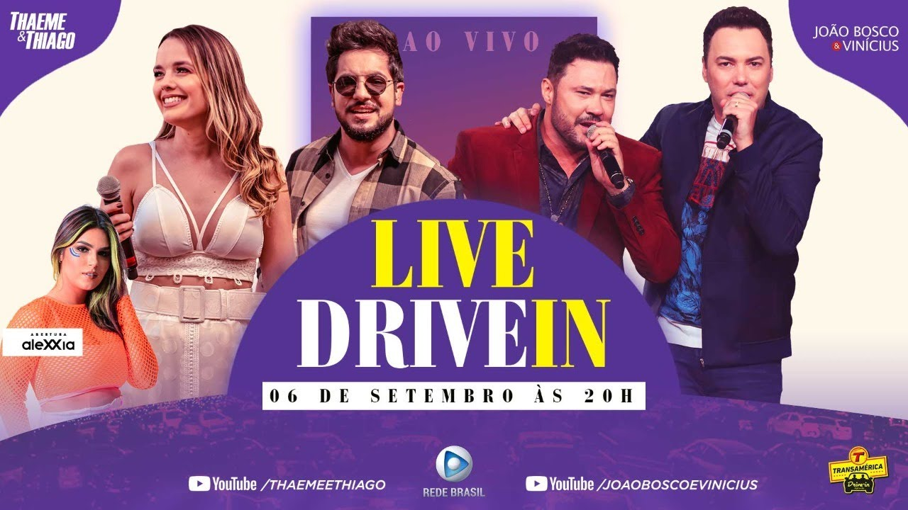 No domingo, dia 06 de setembro, Thaeme e Thiago e João Bosco e Vinícius sobem ao palco do Transamérica Drive In, em Barueri, São Paulo, a partir das 20h. As duplas, que há anos possuem uma relação de amizade, prometem uma apresentação com boas risadas e muita animação e alegria. O show também será transmitido pela Rede Brasil de Televisão e no canal oficial de Thaeme e Thiago no YouTube: www.youtube.com/thaemeethiago